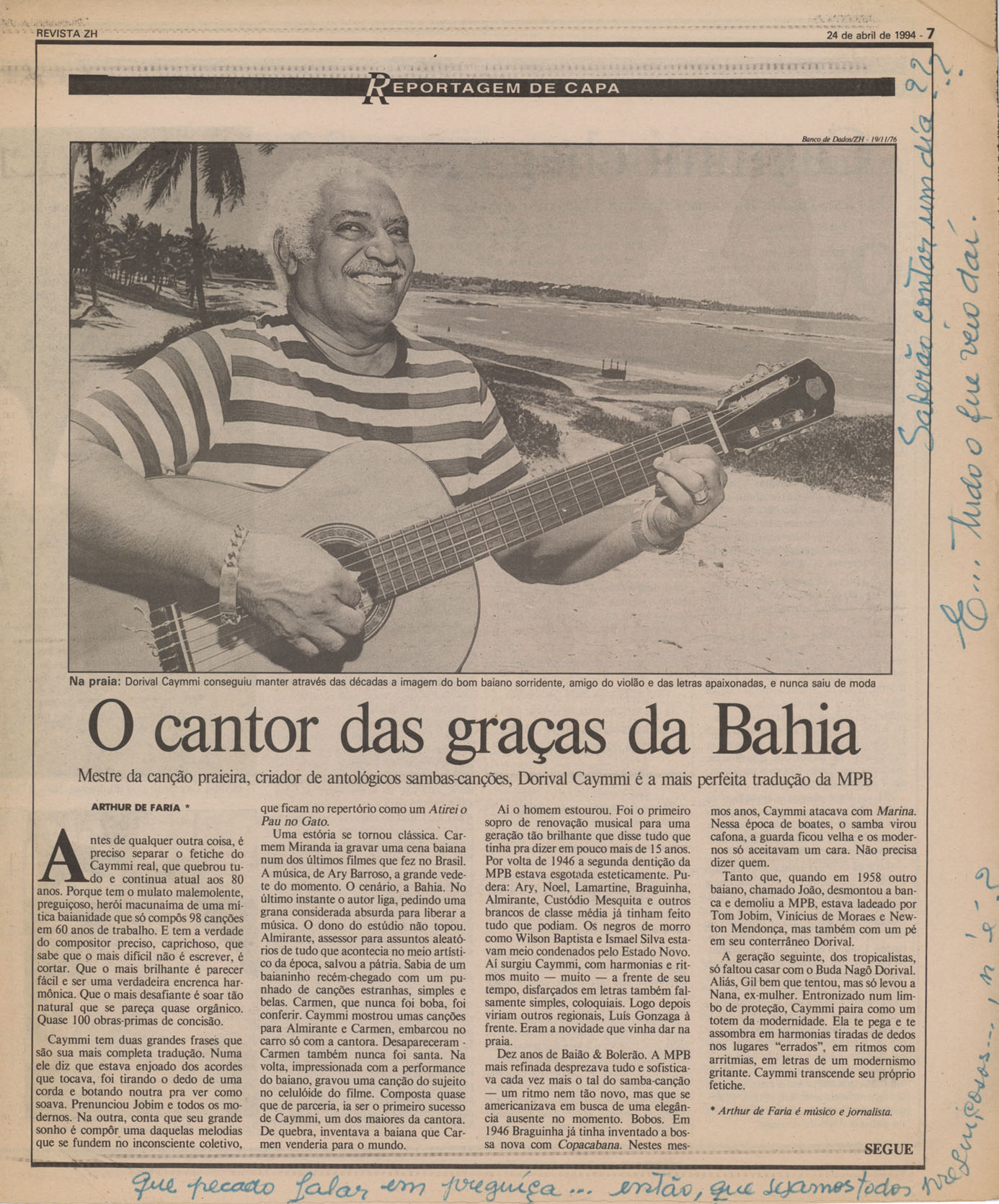 "O cantor das graças da Bahia"; "Caymmi chega aos 80"; "Tom Jobim:Caymmi é gênio"