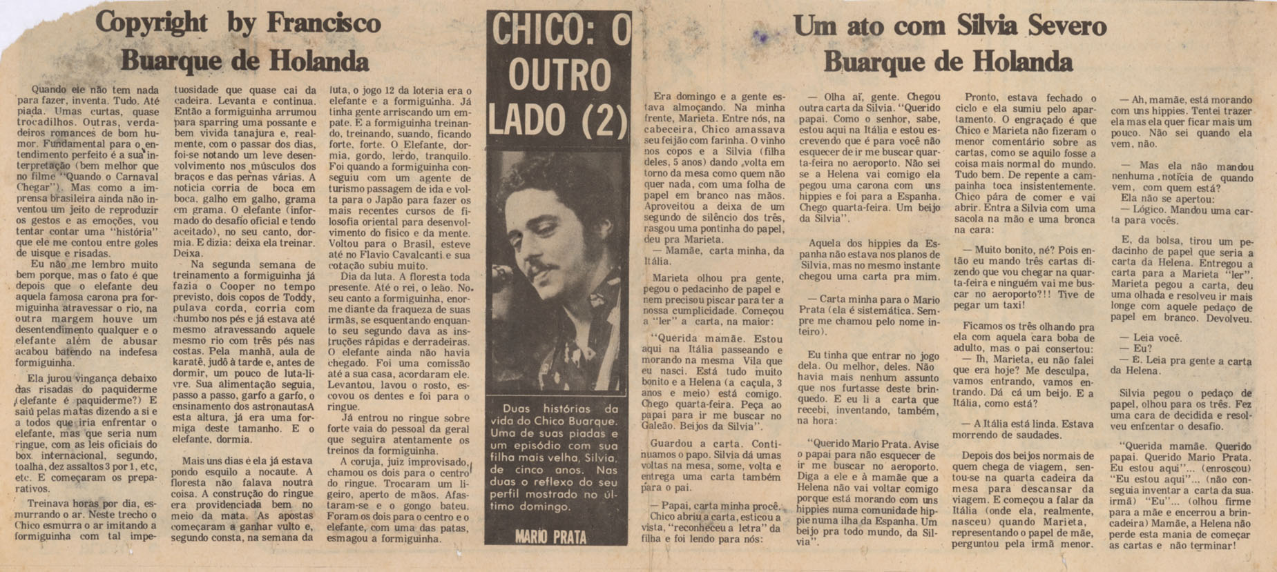| Abstract: | Uma história engraçada contada por Chico Buarque e um episódio com sua filha Silvia Buarque e Marieta Severo são contadas por Mário Prata. |