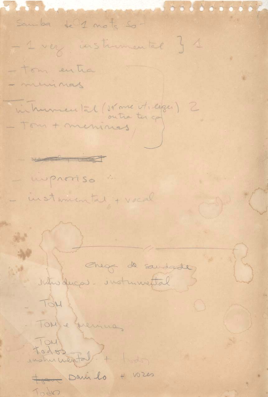 | Description: | Roteiro com as músicas "Samba de uma nota só" e "Chega de saudade". |