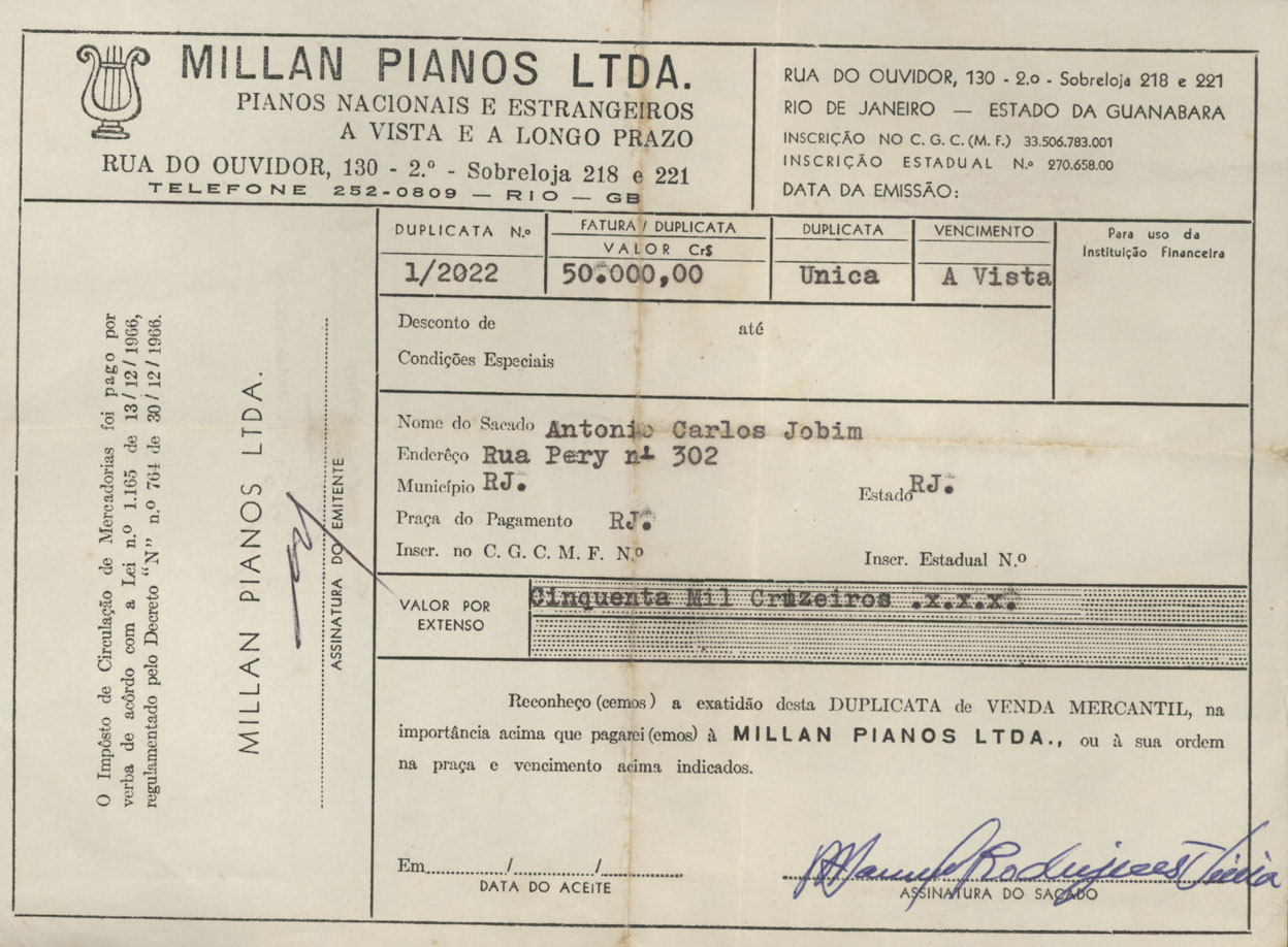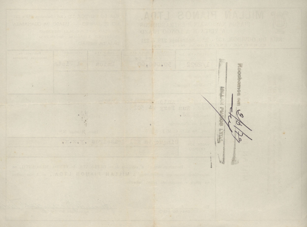 | Description: | Recibo fiscal da compra efetuada por ACJ na loja Millan Pianos. Há assinatura de Maurício Rodrigues Vieira. |