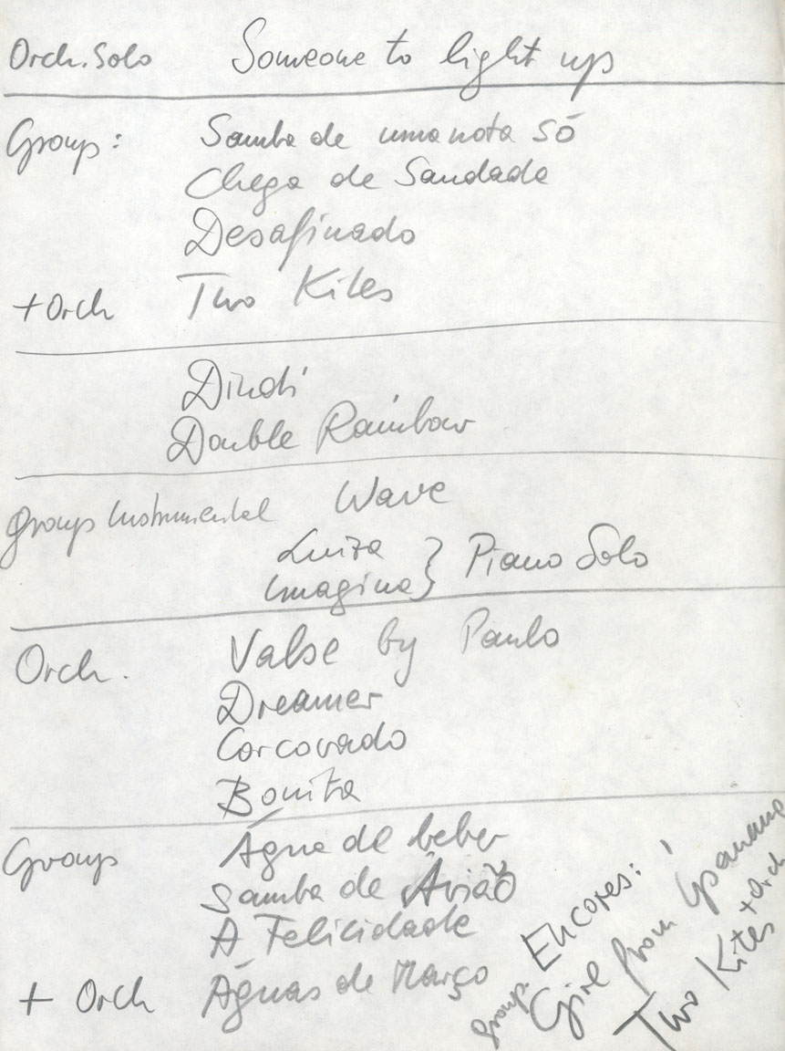 "Someone to light up my life" "Samba de uma nota só" "Chega de saudade" "Desafinado" "Two kites" "Double rainbow" "Wave" "Luiza" "Imagina" "Valse" "Dreamer" "Corcovado" "Bonita" "Água de beber" "Samba do avião" "A felicidade" "Águas de março" "The girl from Ipanema" JOBIM, Paulo ORF-Sinfonietta GUTH, Peter Banda Nova |