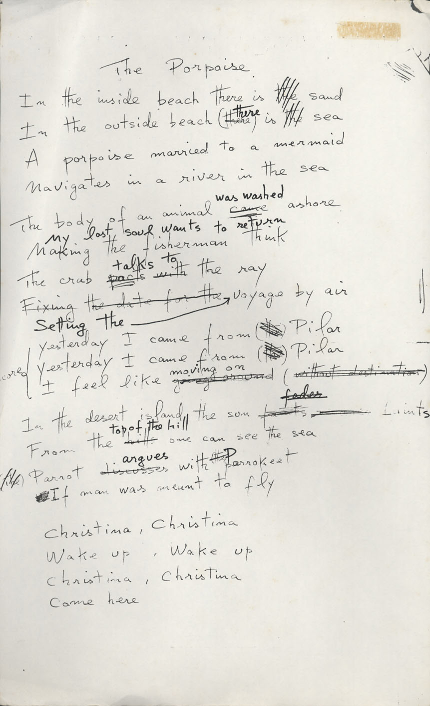 Antonio Carlos. Versão: "The porpoise". s.l., s.d. 2 fls. Manuscrita do autor com emendas. Inglês. 21,5x35,5cm. Cópia xerox.