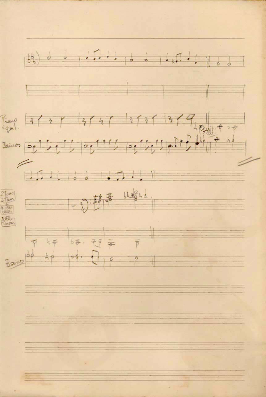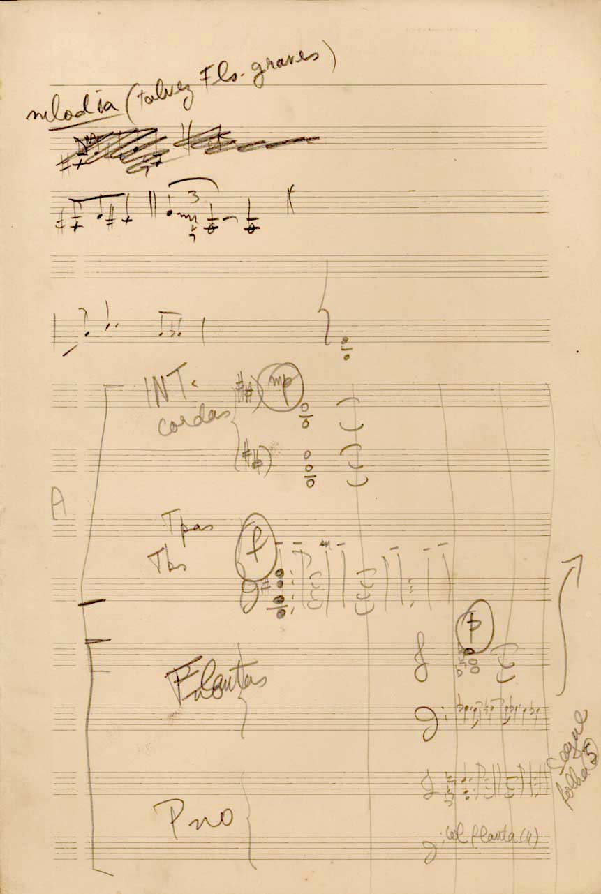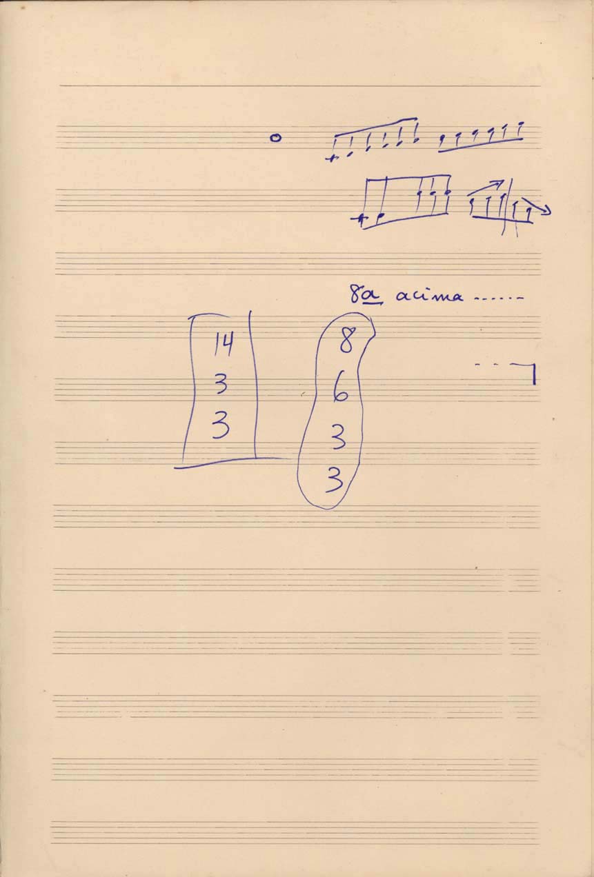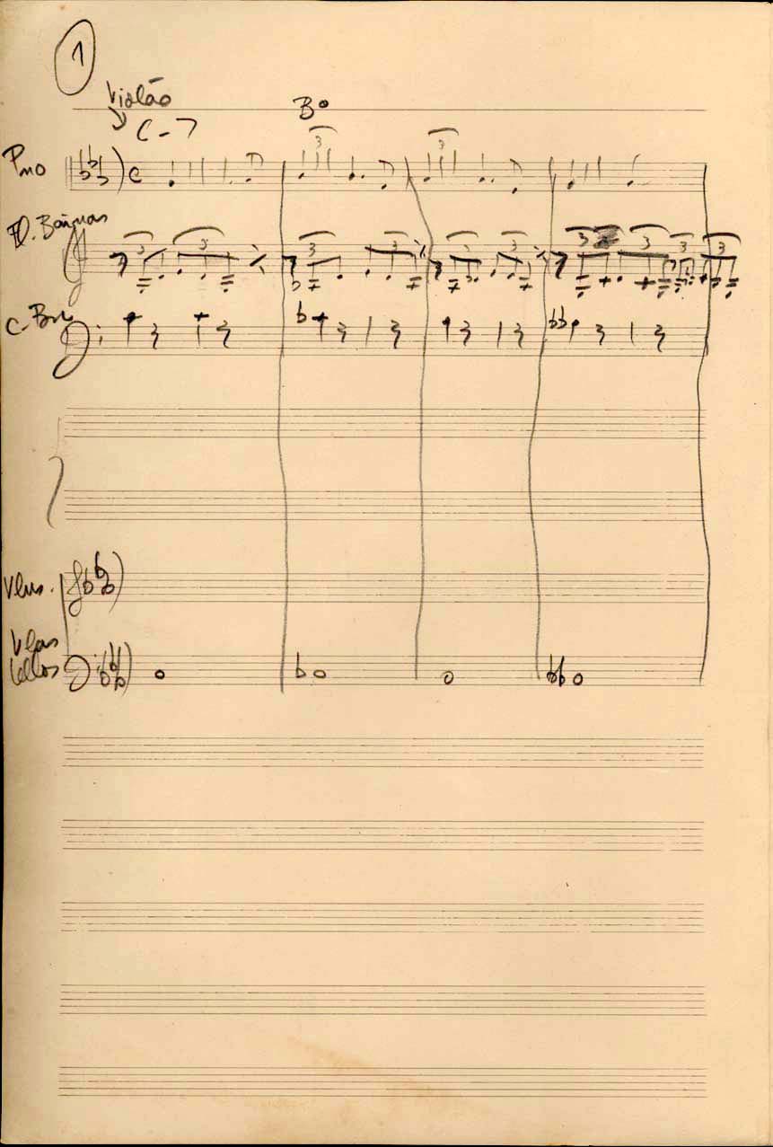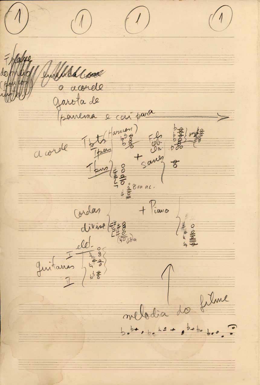 | Note: | A melodia do documento principal é um esboço de "Sabiá" (ACJ e Chico Buarque). Trata-se de esboços de arranjo para os discos "Tide", "Stone Flower" e para a trilha do filme "The adventurers" (Os aventureiros), de Lewis Gilbert, de 1969. A partitura em dó menor (Cm) citada é de "Olha maria" ("Amparo") de ACJ/Vinicius de Moraes/Chico Buarque. A melodia e grade em ré maior (D) é de "Tide", de ACJ. |
