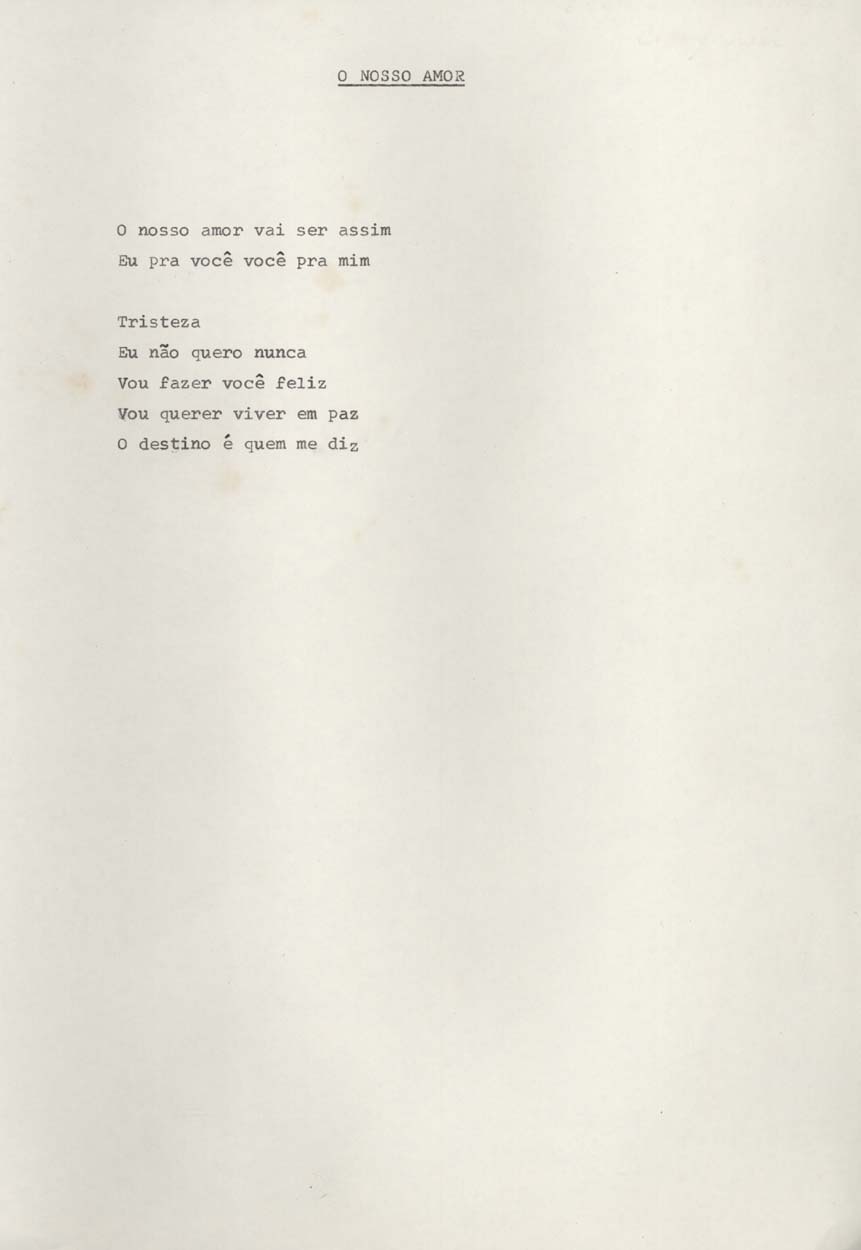 | Description: | Transcrição da letra de "O nosso amor" de ACJ e Vinicius de Moraes. |