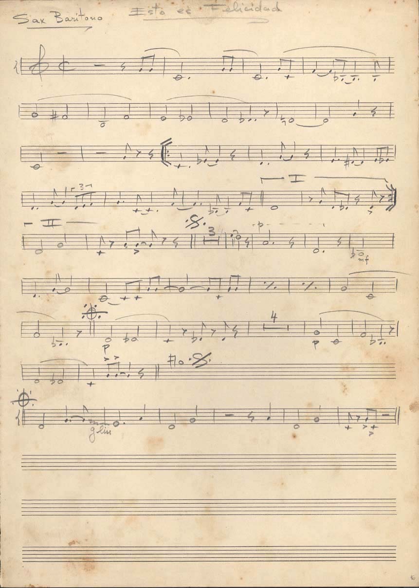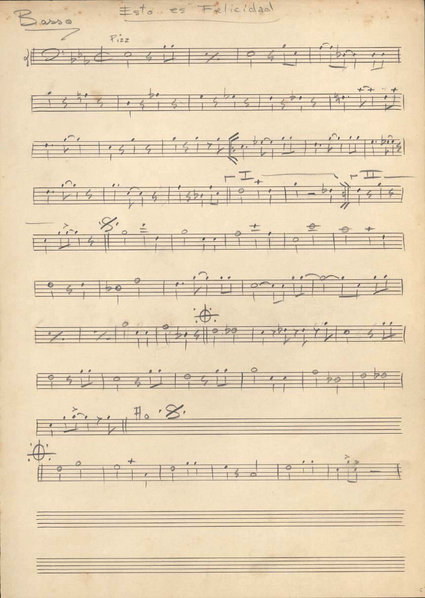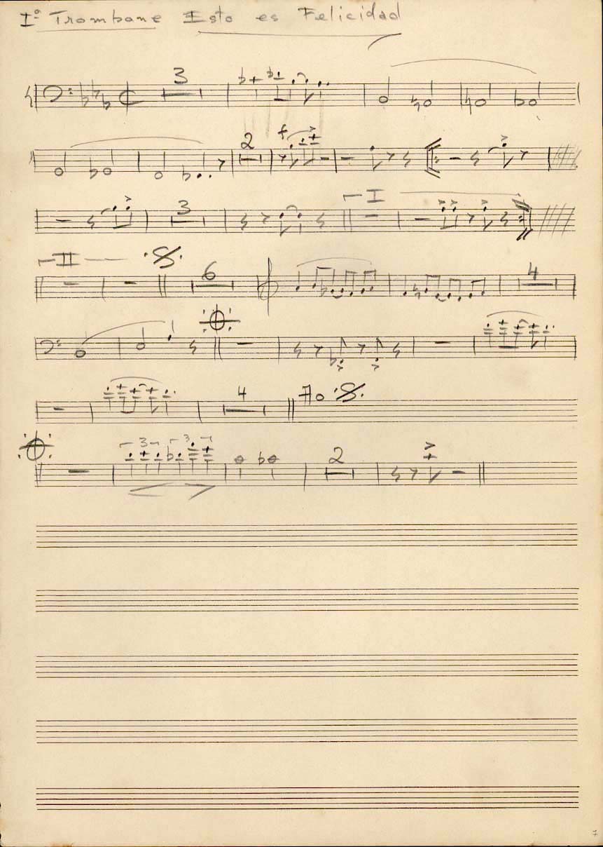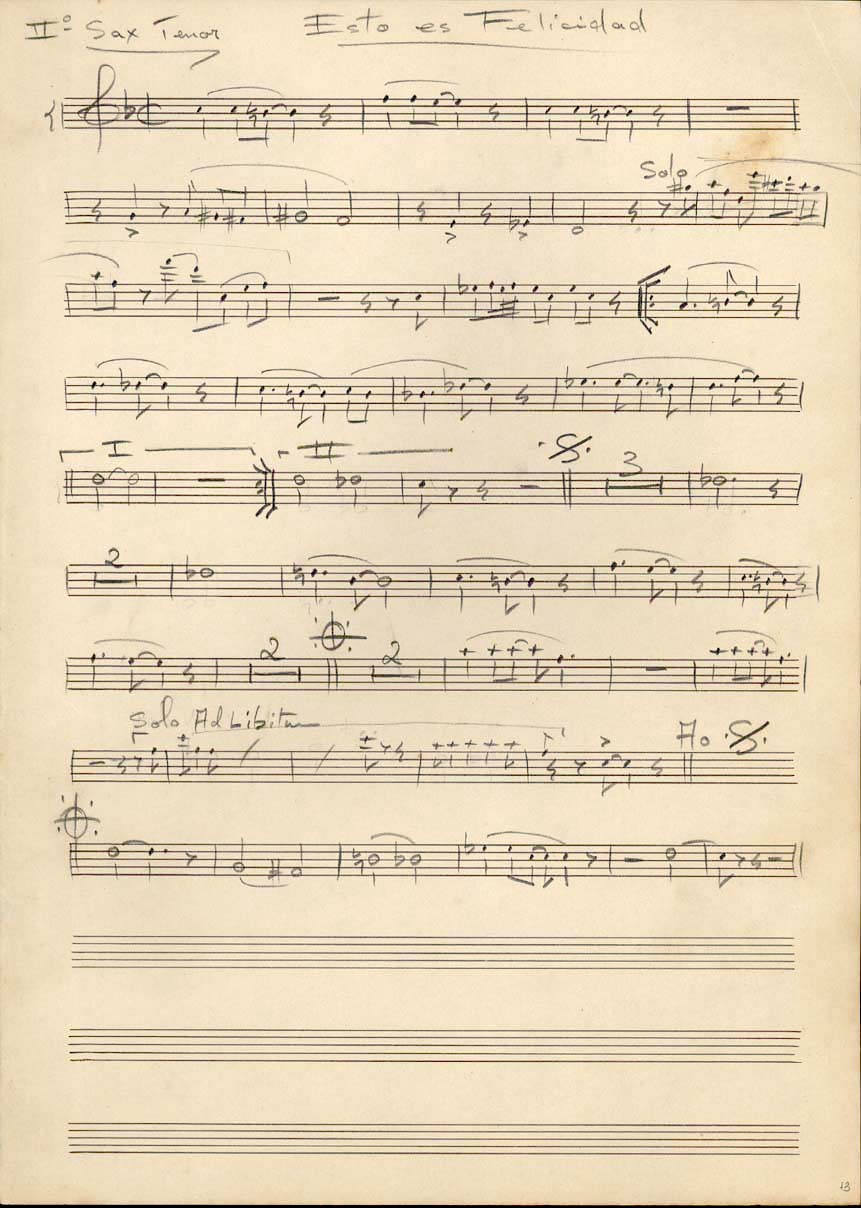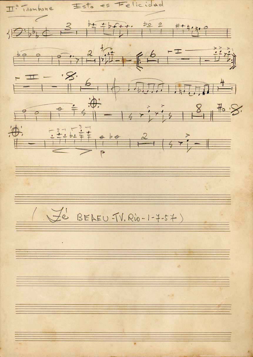 tenor, duas fls; sax-barítono, uma fl; 1º, 2º e 3º trumpetes, três fls; 1º e 2º trombones, duas fls; 1º, 2º, 3º e 4º violinos, quatro fls; contrabaixo, uma fl. 23,2x32cm.