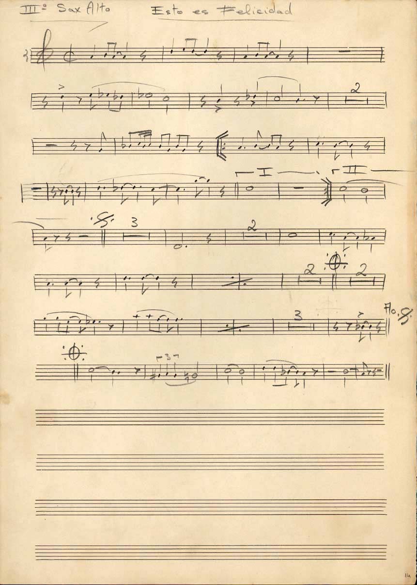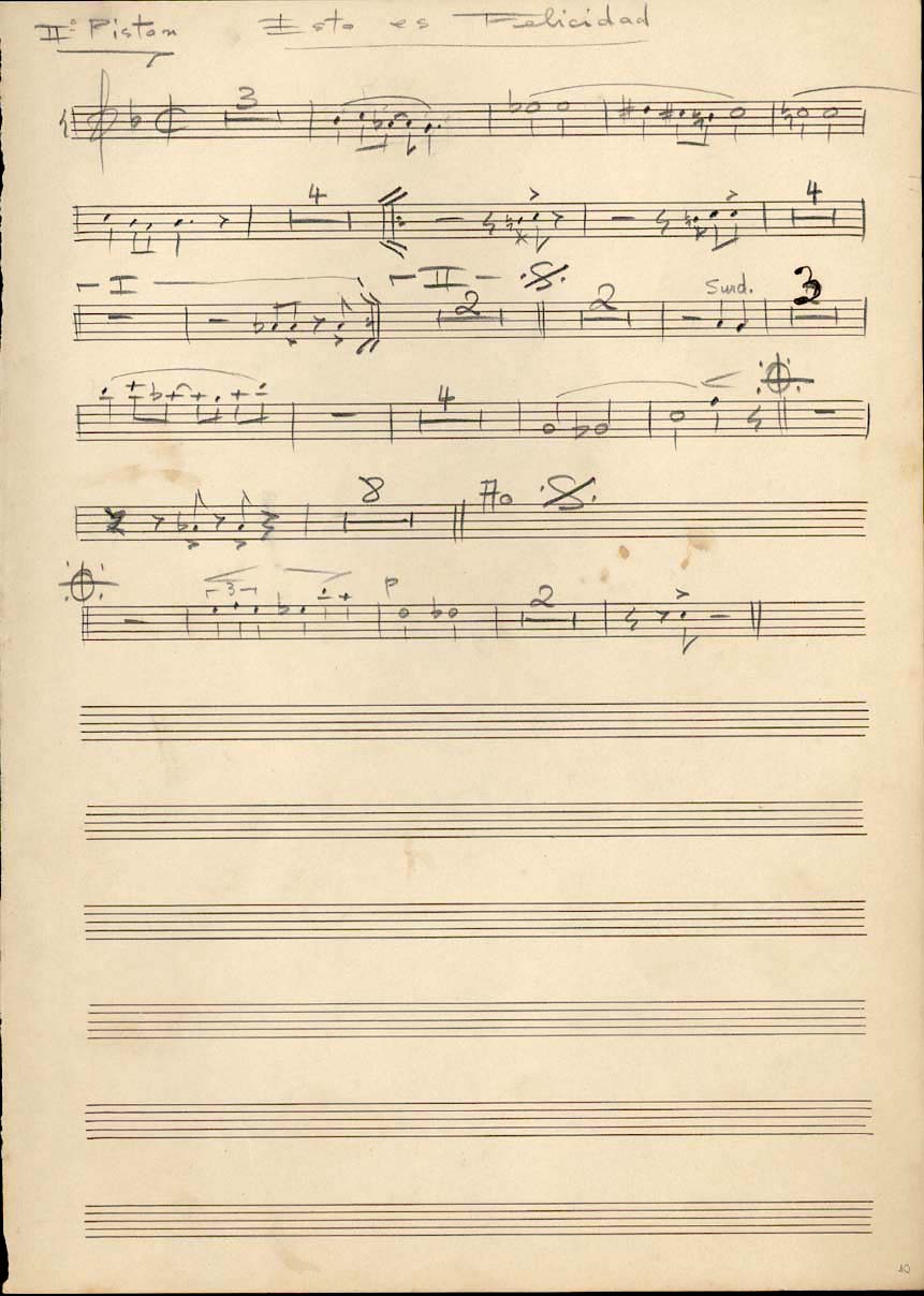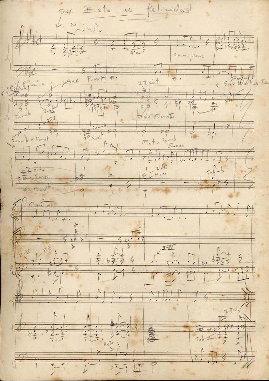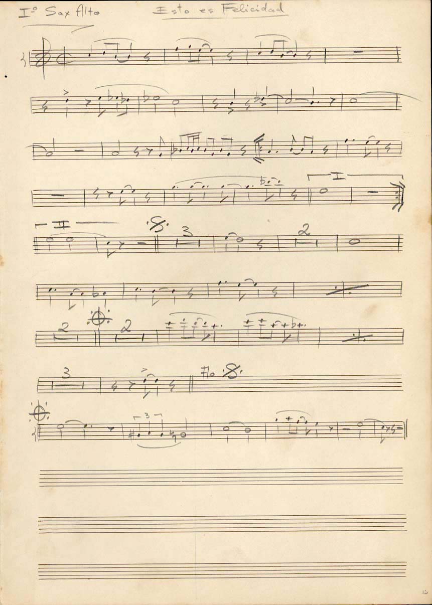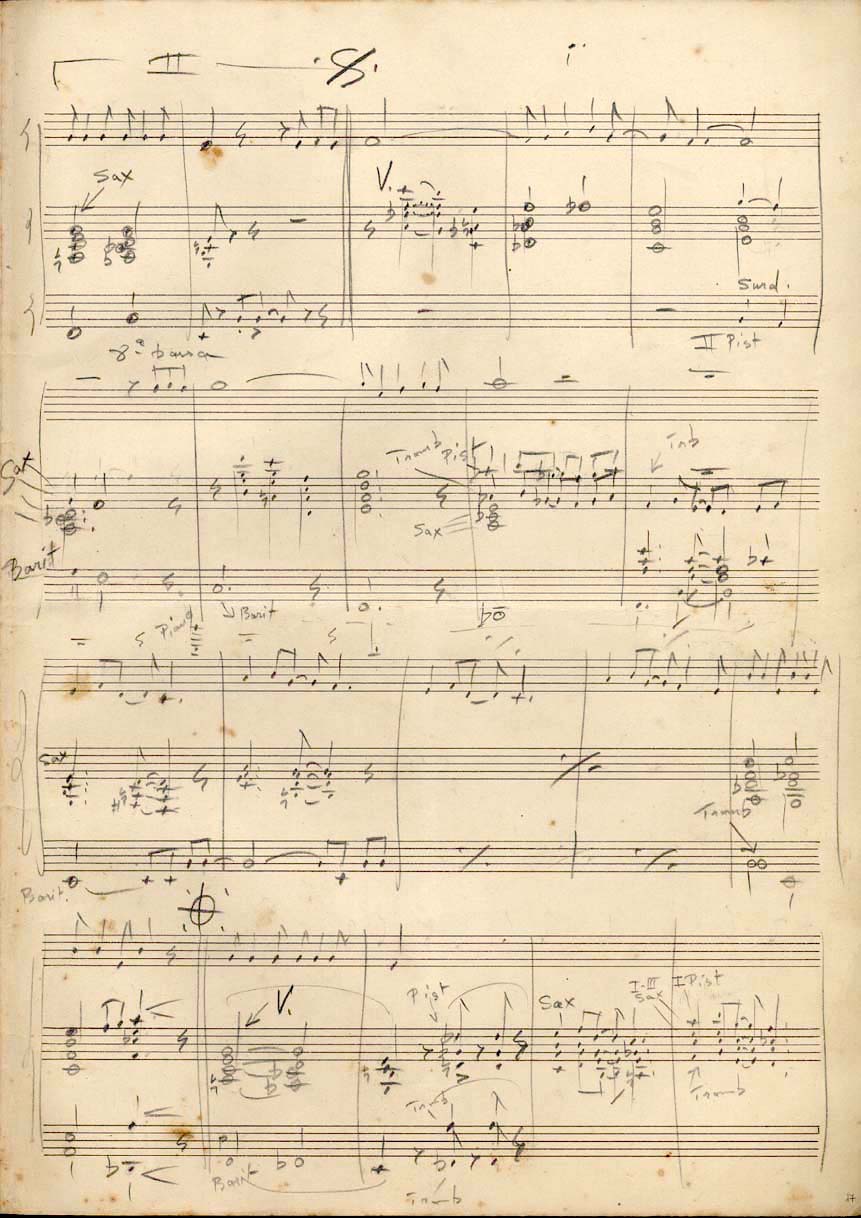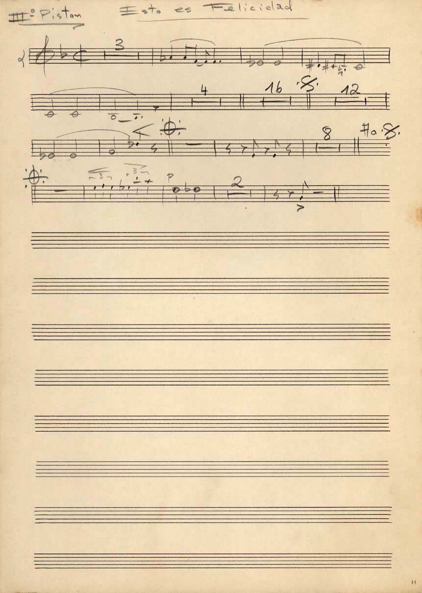 tenor, duas fls; sax-barítono, uma fl; 1º, 2º e 3º trumpetes, três fls; 1º e 2º trombones, duas fls; 1º, 2º, 3º e 4º violinos, quatro fls; contrabaixo, uma fl. 23,2x32cm.