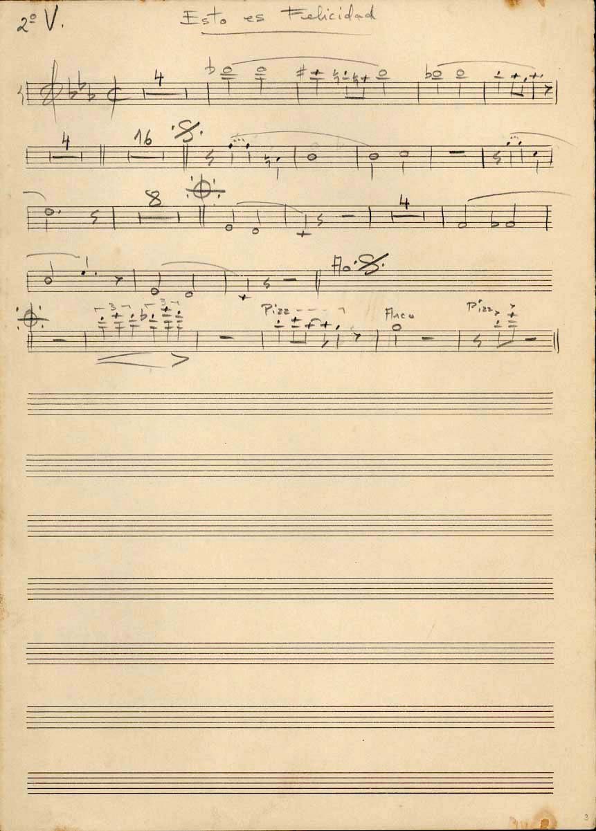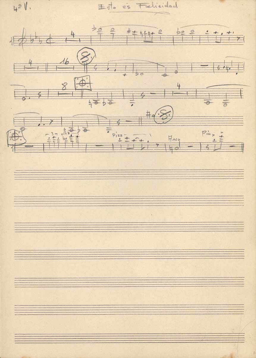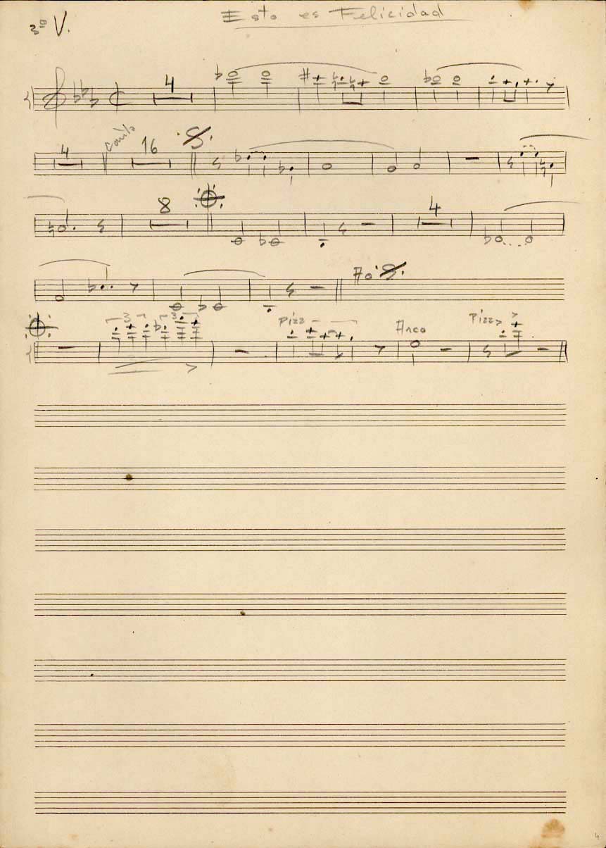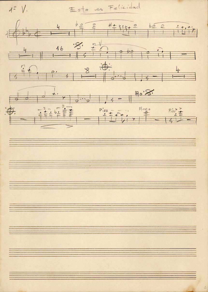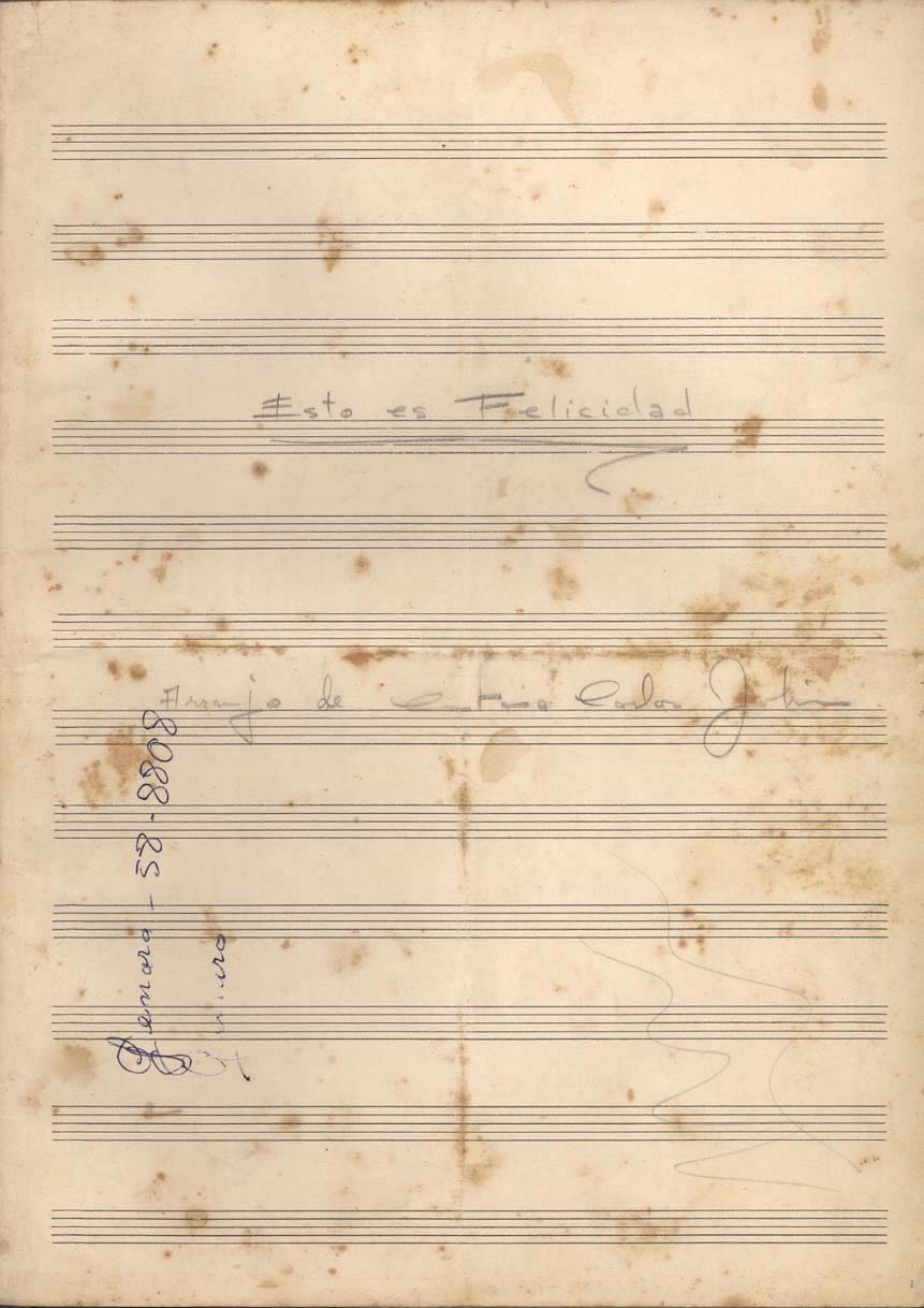 tenor, duas fls; sax-barítono, uma fl; 1º, 2º e 3º trumpetes, três fls; 1º e 2º trombones, duas fls; 1º, 2º, 3º e 4º violinos, quatro fls; contrabaixo, uma fl. 23,2x32cm.