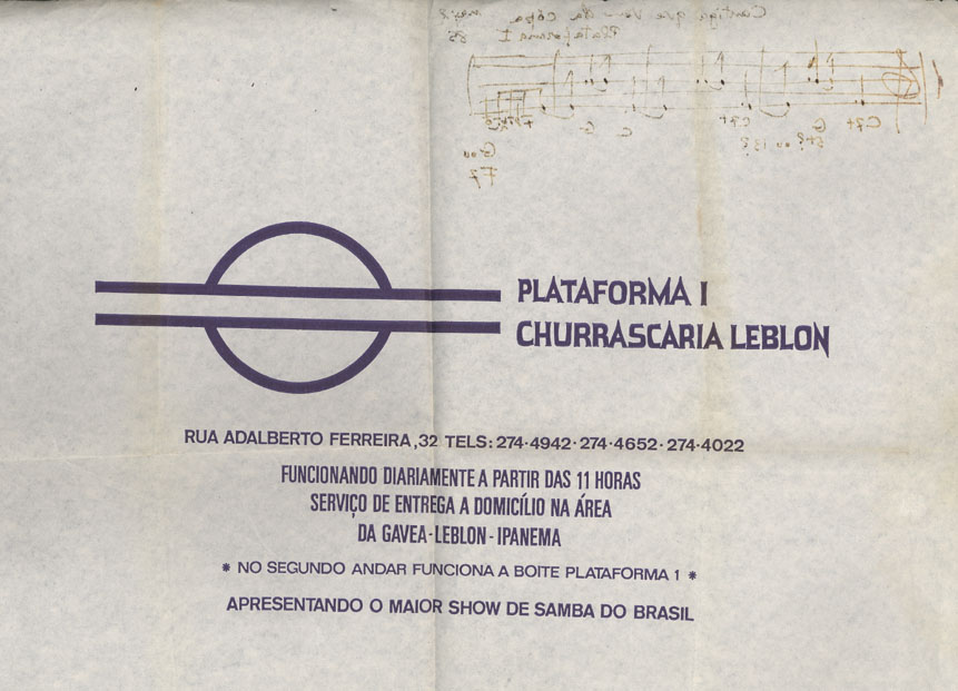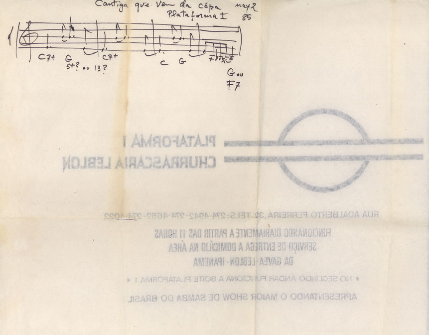 | Description: | Melodia escrita em papel toalha da Churrascaria Plataforma. |