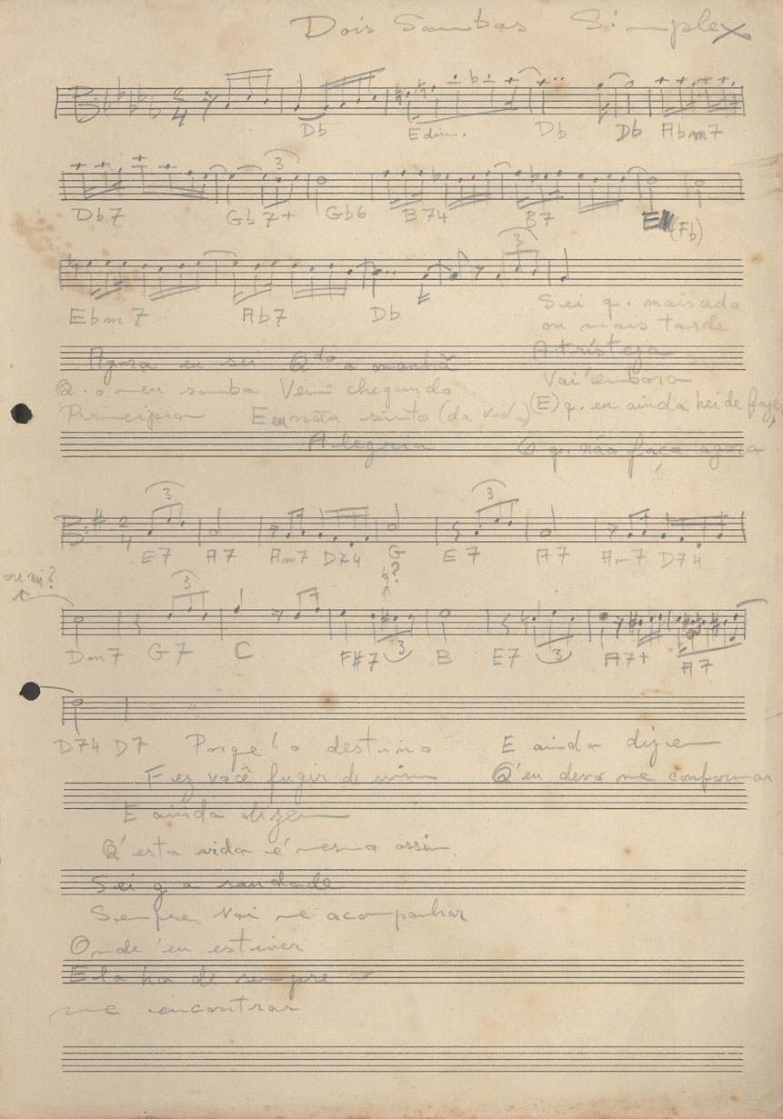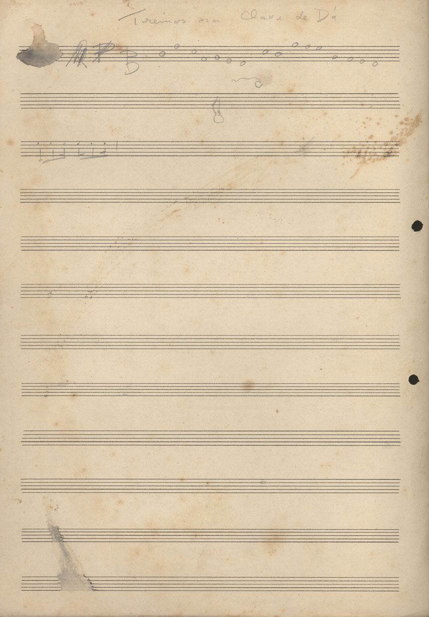 | Description: | Na mesma página, há melodia original em sol maior (G) com rascunho de letra. No verso há rascunho de melodia ("Treinos na clave de dó"). |
