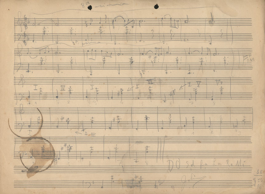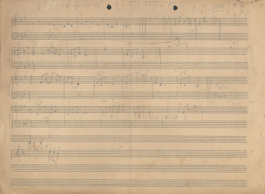 | Description: | No documento há: parte de piano original em lá menor (Am), incompleta. Parte de piano em fá sustenido menor (F#m), incompleta. Parte de piano em sol maior (G), incompleta. Melodia em si bemol maior (Bb) em 6/8 e 2/4. Parte de piano em fá maior (F). |