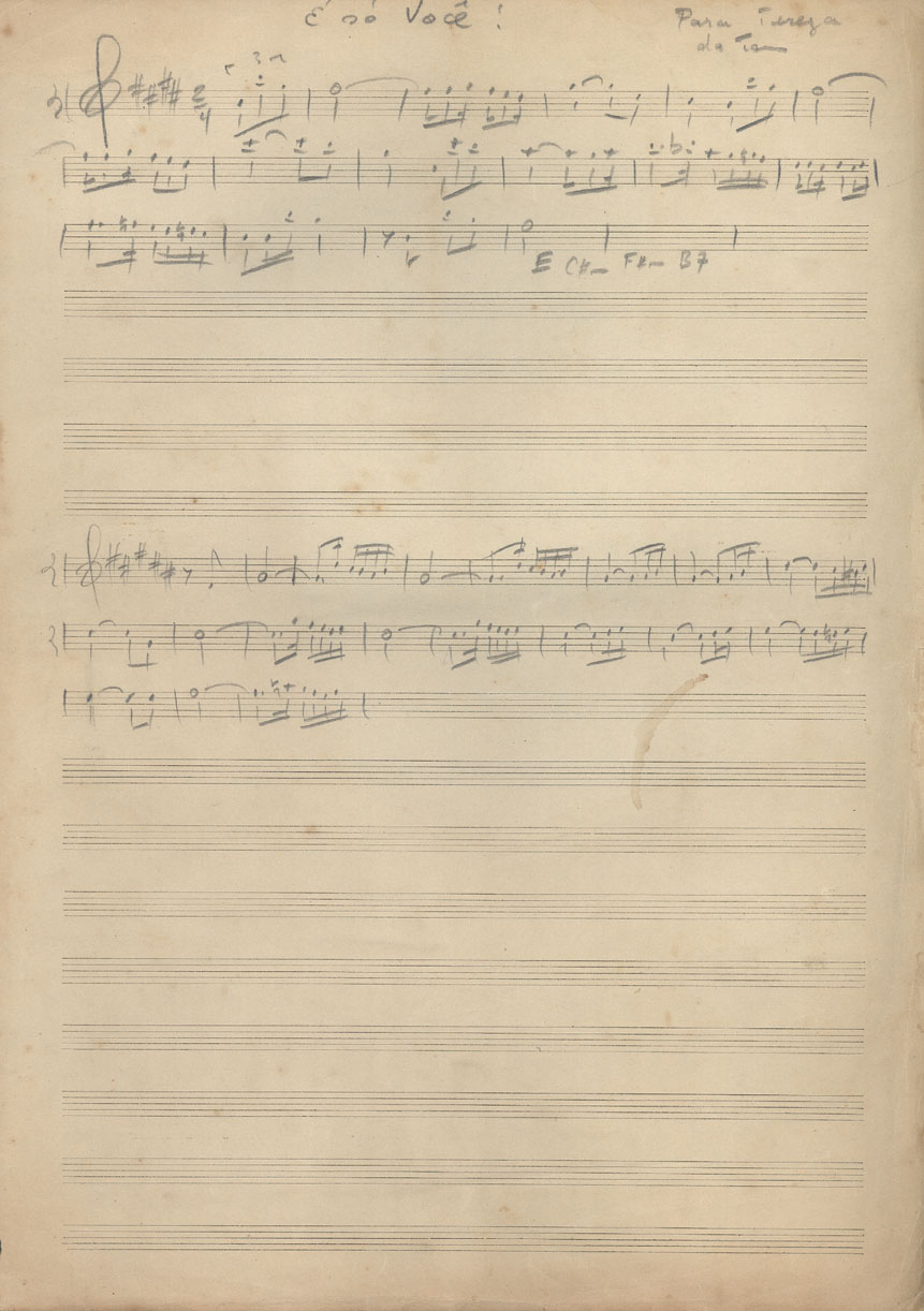 | Description: | No documento há: dedicatória para Thereza Hermanny Jobim. Na mesma página, há outra melodia, sem título, incompleta, em sol sustenido menor (G#m). |