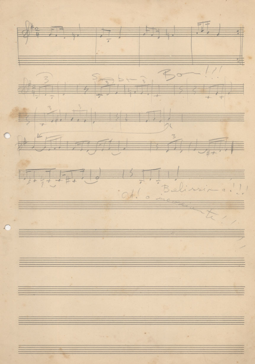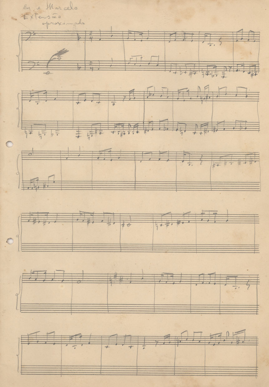 | Description: | Há comentários de ACJ sobre a composição. Na mesma página, há quatro compassos de melodia em sol maior (G). Na 3ª página (terminando na 2ª) há melodia a duas vozes na clave de fá, incompleta; e menção a Marcelo Brasileiro de Almeida. |