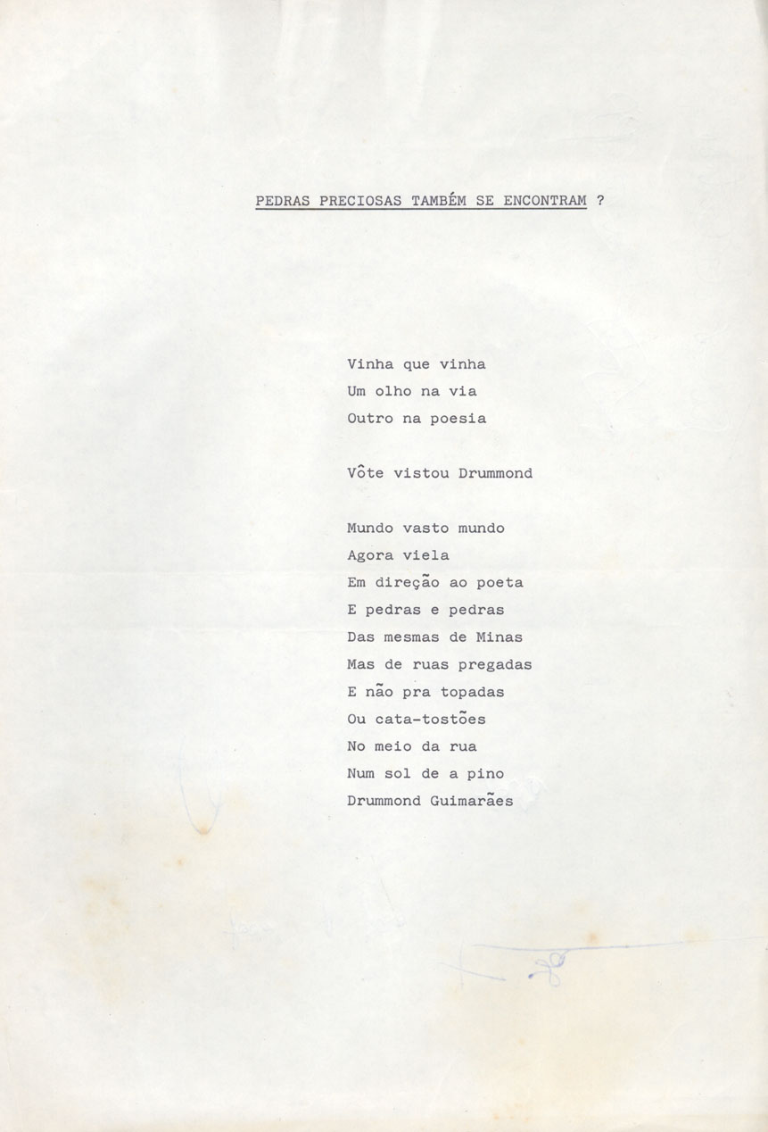 | Description: | Poema de autoria não identificada. Existem referências a Carlos Drummond de Andrade. No verso do documento há rasuras de João Francisco Jobim. | |