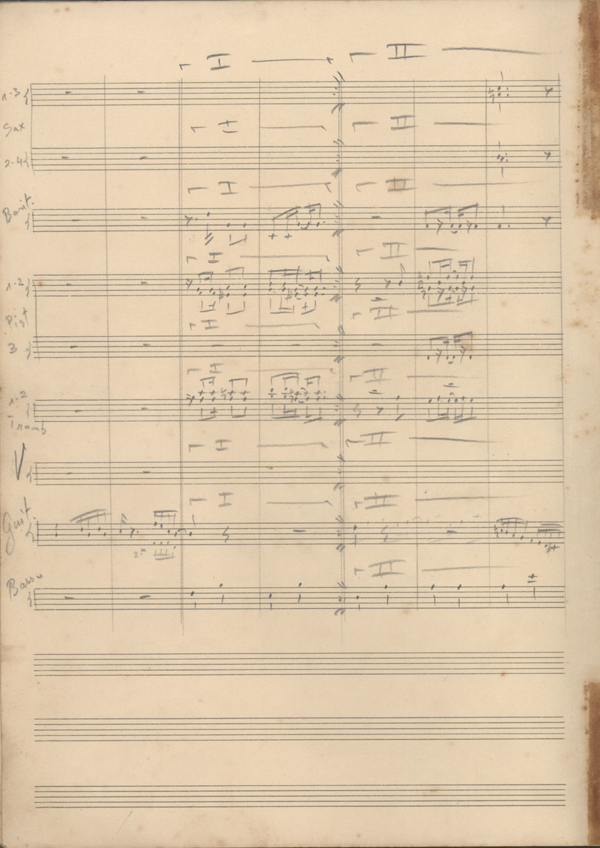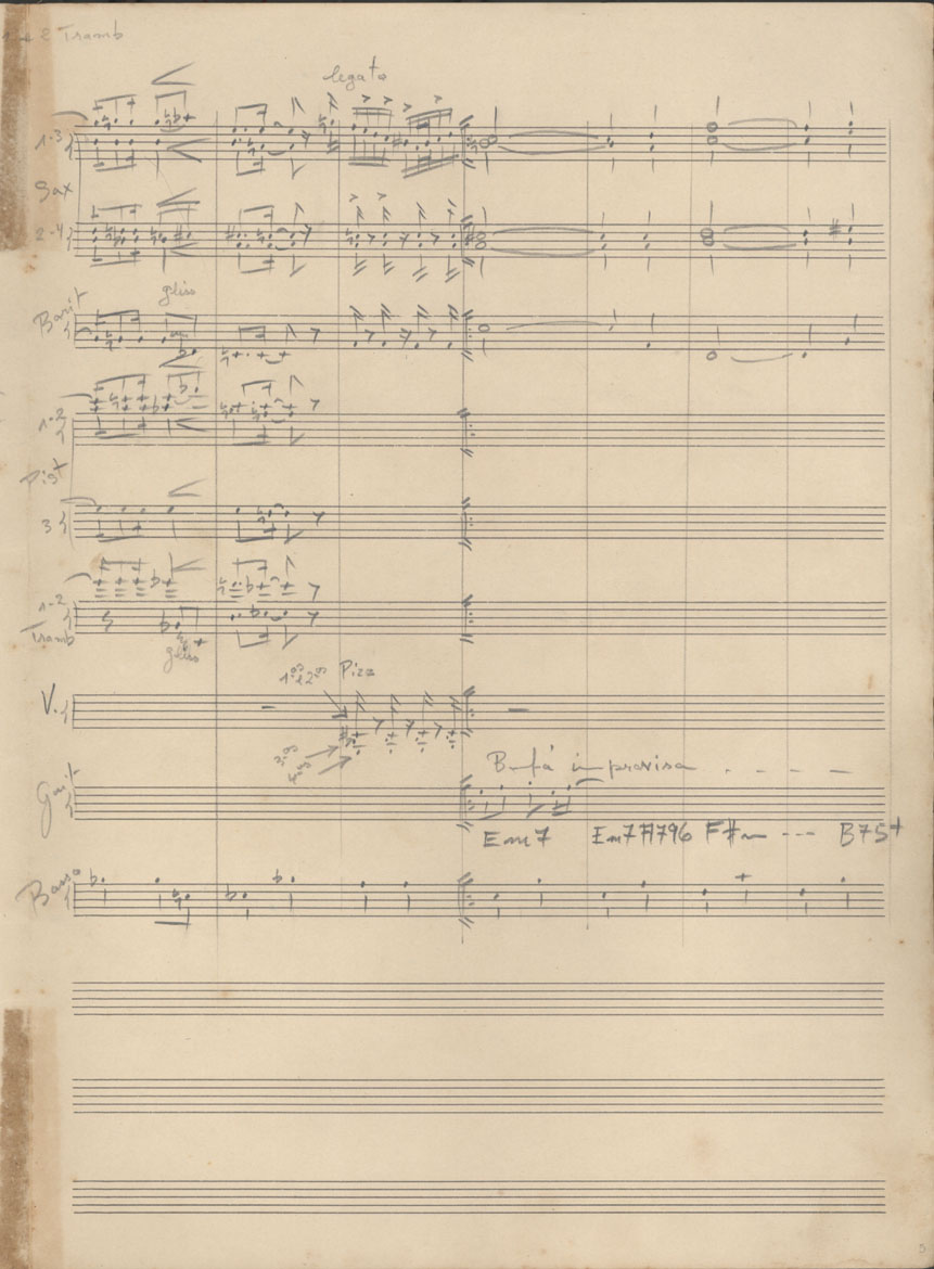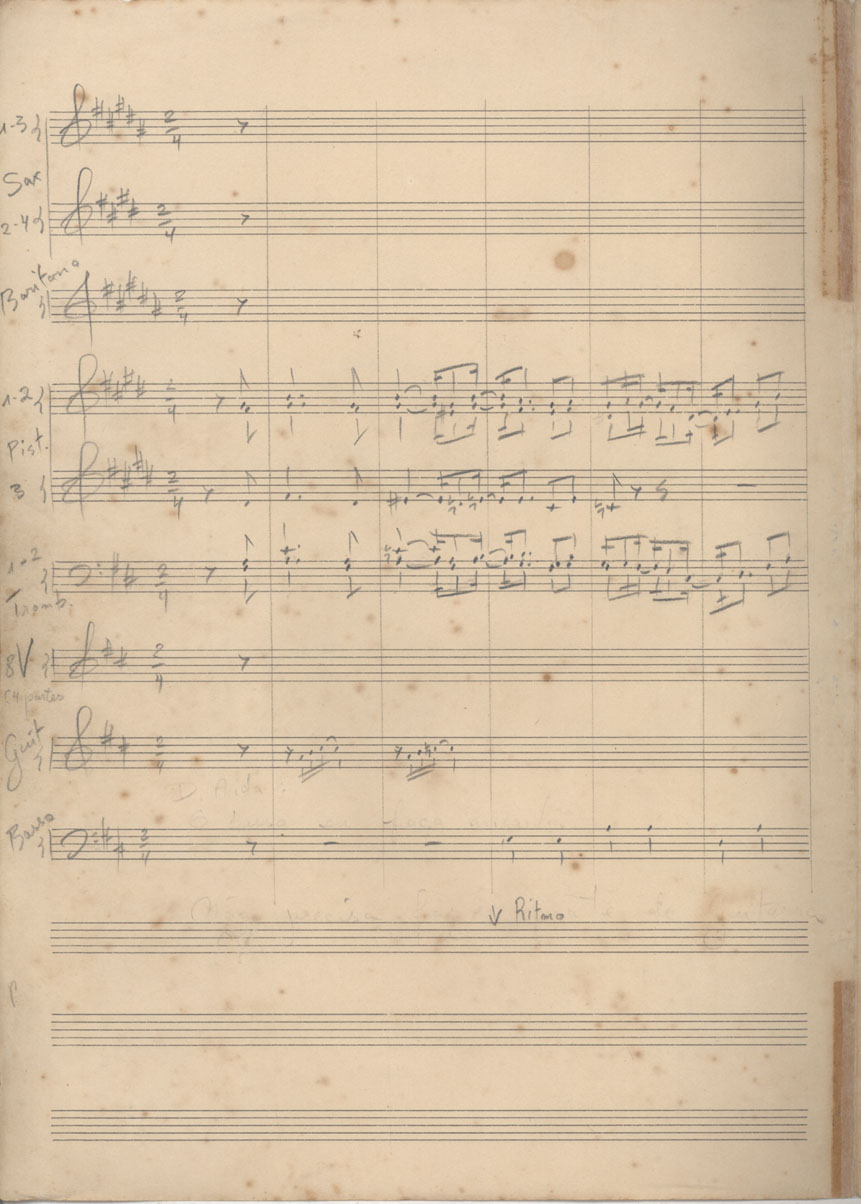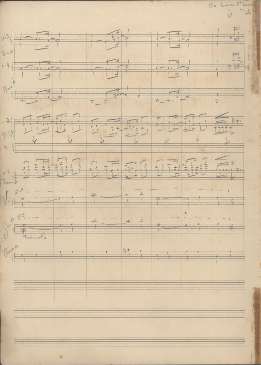 | Abstract: | Partitura em ré maior (D) para cinco saxofones, dois trombones, três trompetes, oito violinos, guitarra e contrabaixo. | |
