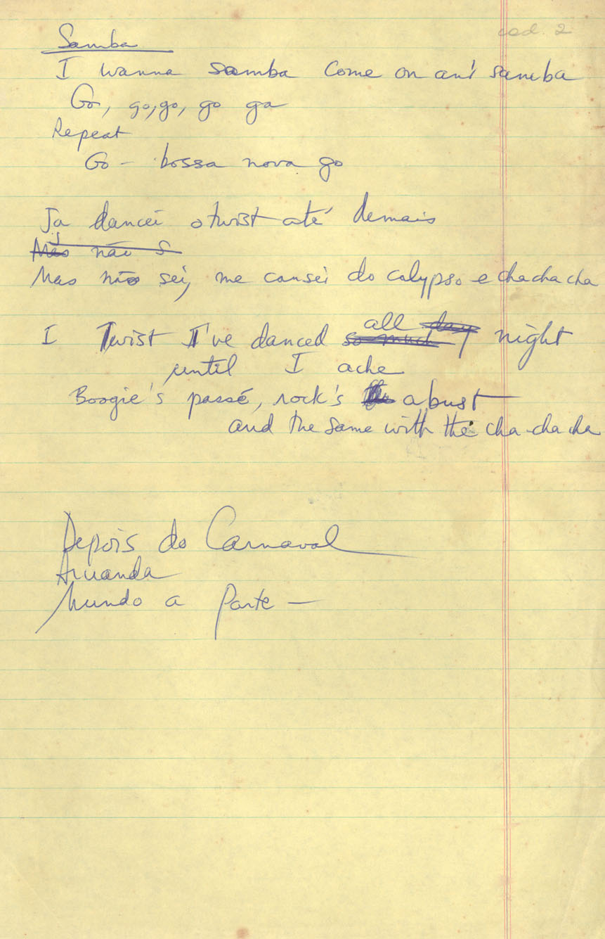 | Description: | Rascunho de versão em inglês para "Só danço samba" de ACJ e Vinicius de Moraes. Caligrafia não identificada. |