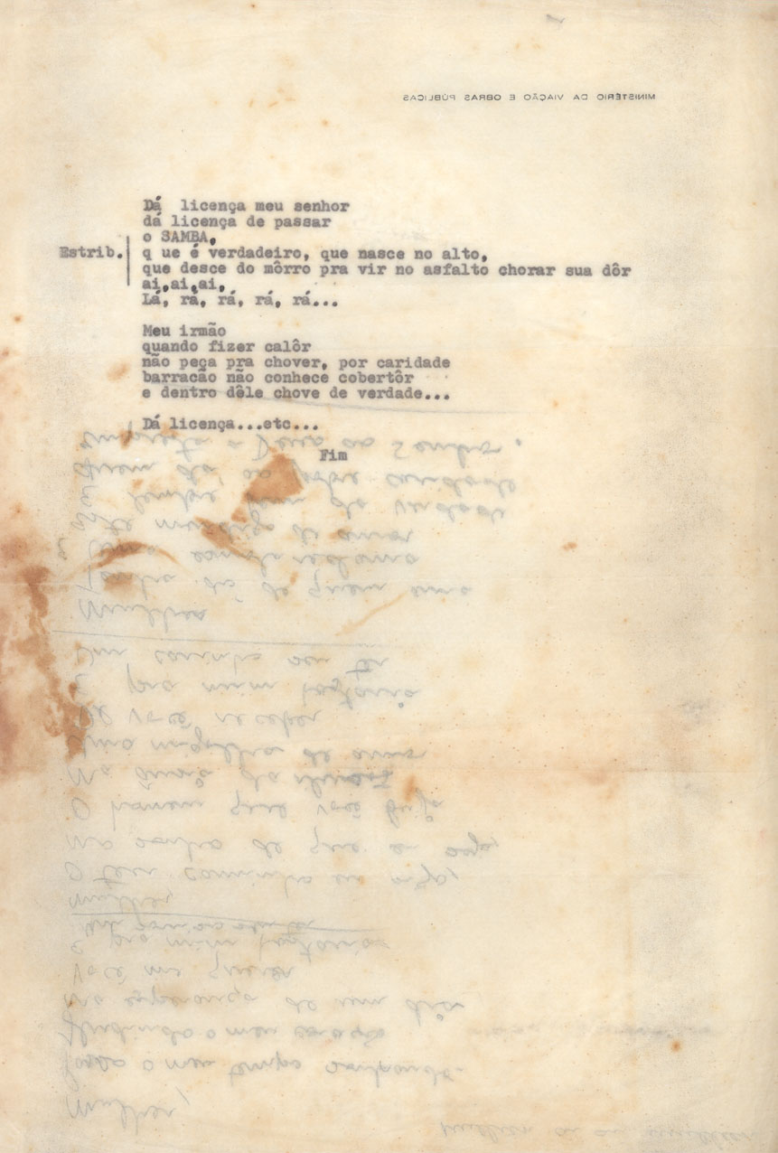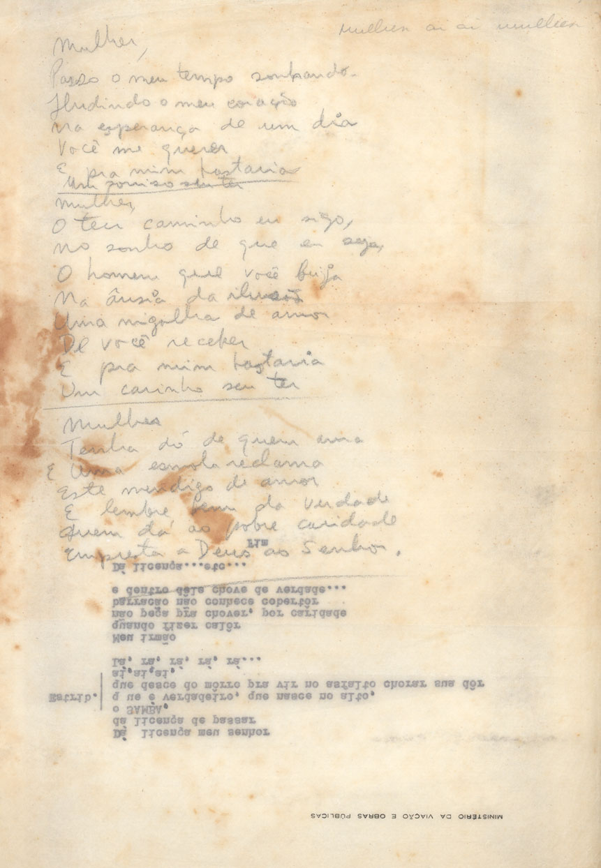 | Description: | Letra de música e caligrafia não identificadas. Há no verso do documento letra datilografada de "Descendo o morro" de Billy Blanco e ACJ. |