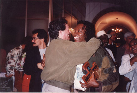 | Abstract: | Milton Nascimento abraça um amigo, durante festa. |