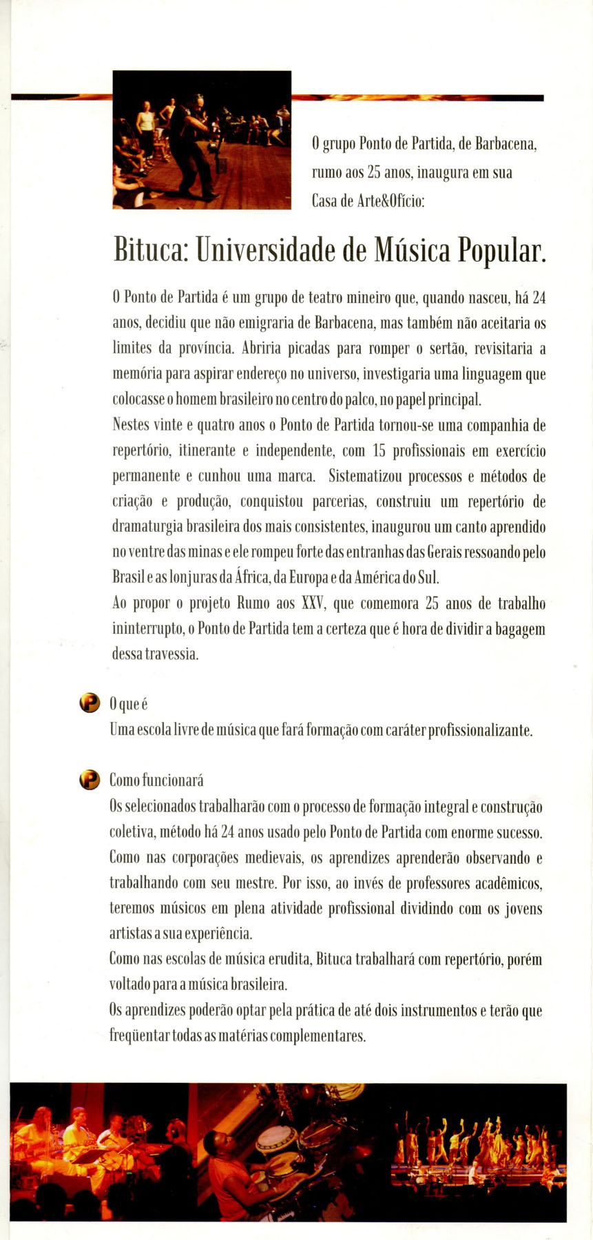 | Note: | A "Bituca Universidade de Música Popular", funciona desde 2004 e fica em Barbacena, no Estado de Minas Gerais. É uma escola gratuita, livre, que faz formação com caráter profissionalizante. |