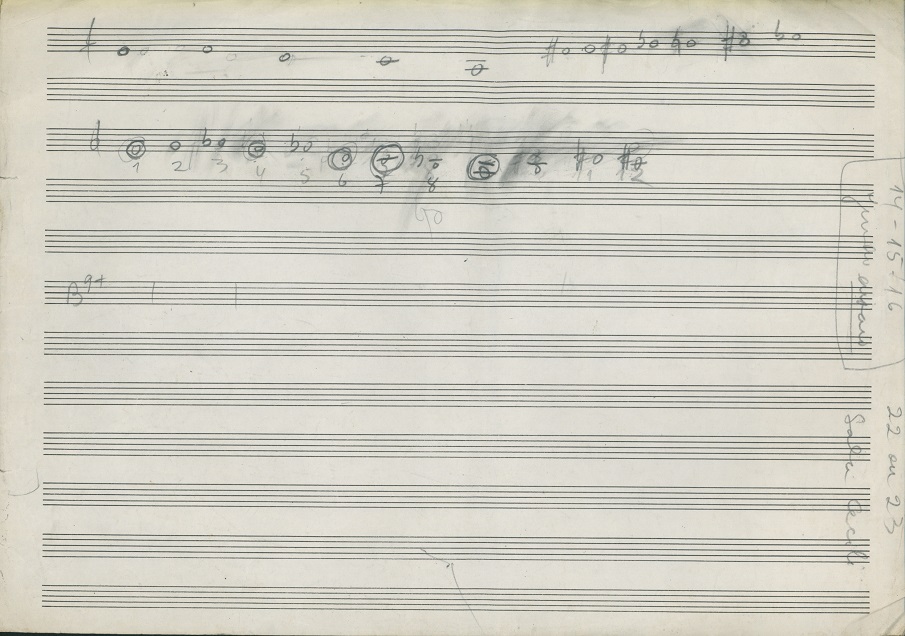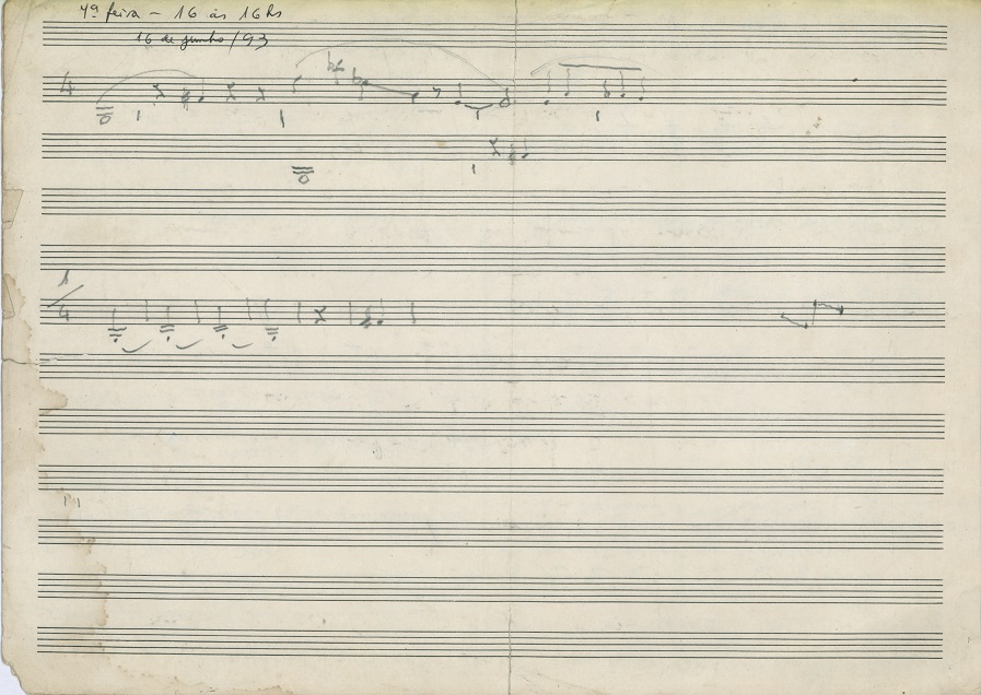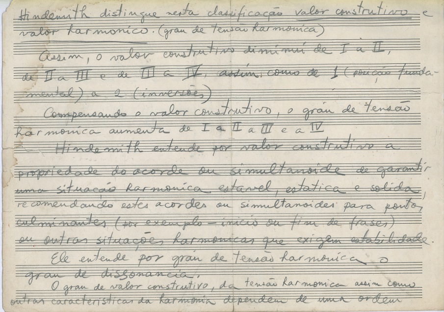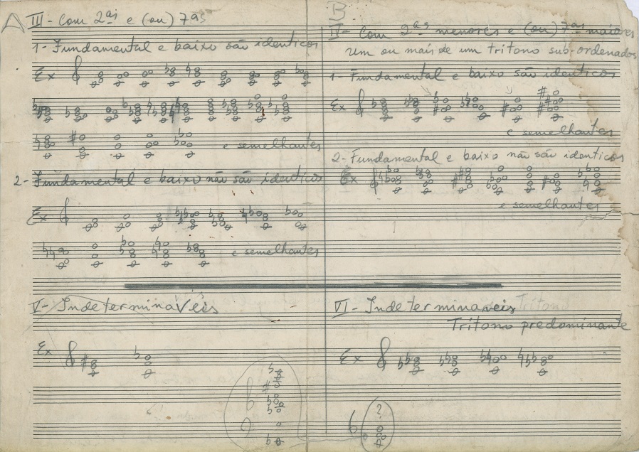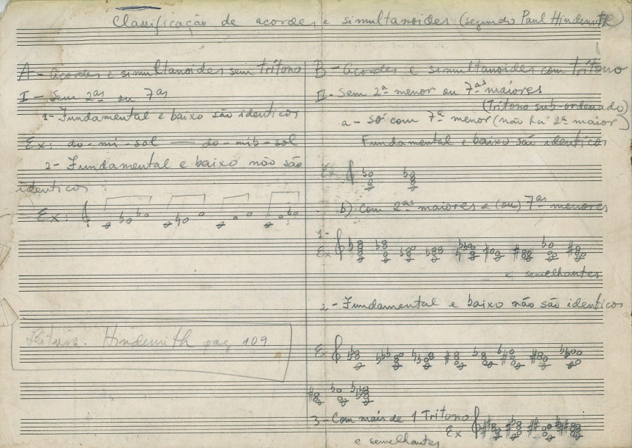 | Note: | Estudos sobre harmonização de melodias modais e classificação de acordes e simultanoides baseado na leitura de Paul Hindemith. A página dois contém duas séries dodecafônicas. |