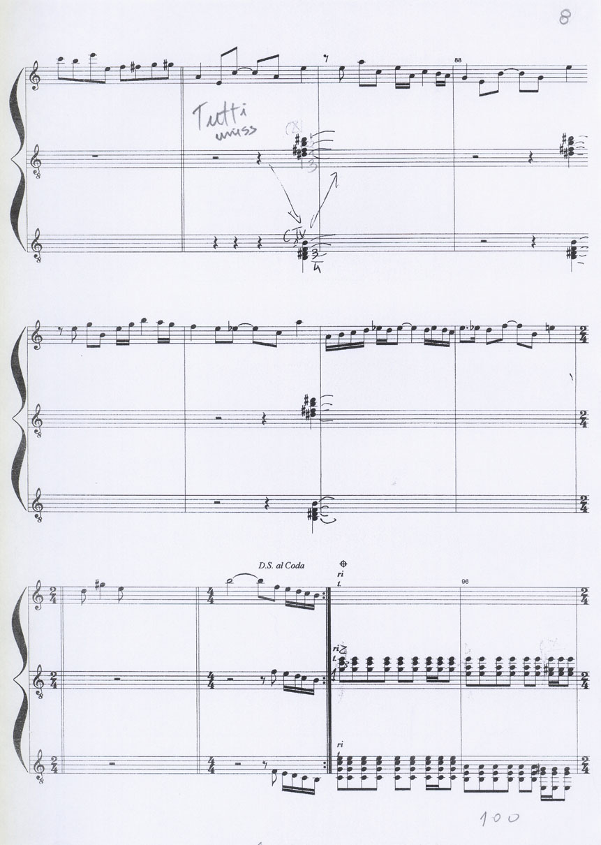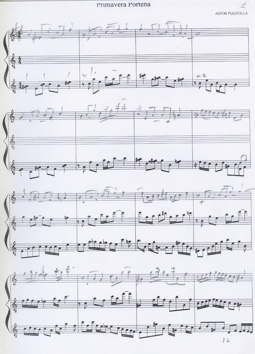 Na página 1 a parte para clarineta escrita a lápis está na tonalidade correta para o instrumento, na página 2 a escrita está na tonalidade para instrumentos em dó. Documento impresso com anotações à lápis. Arranjo feito para o projeto com duo Siqueira Lima (Violões), onde apresentaram repertório de composições de Astor Piazzolla e Radamés Gnattali. |